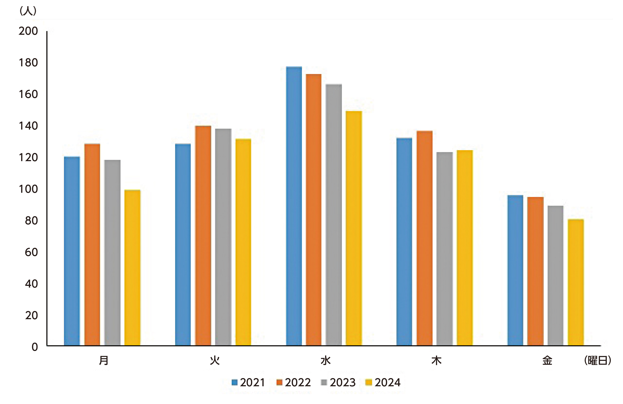 図2. 年度別の曜日ごとの外来患者数の推移。斜視小児外来がある火曜日はなかなか減りません。木曜日は途中医師数が増えたため患者数はそれほど減っていません。