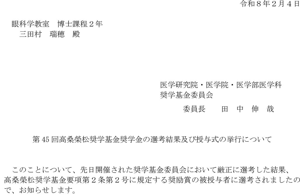 三田村 瑞穂先生が優れた業績をあげた若手研究者に授与される、第45回高桑榮松奨学基金奨励賞を受賞されました。