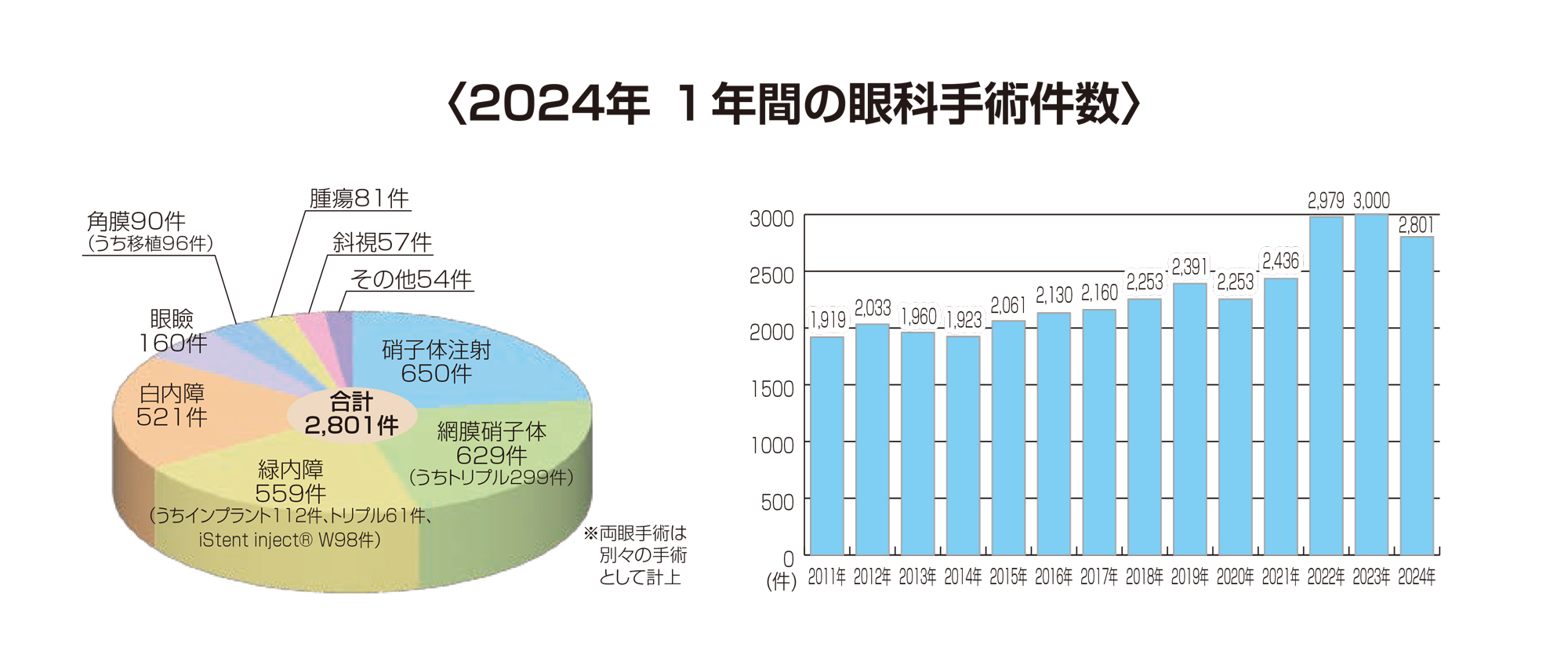 これまでと相変わらず大学病院の入院・手術件数は増加傾向にあります。そのような中、可能な限り患者を受け入れるのが中核病院としての大学病院の責務と考えており、御紹介いただいた際には待機手術・臨時手術を問わず基本的に断らない方針としています。2023年に引き続き、網膜剥離や緑内障発作などの臨時手術が420件と大幅に増加し、地域医療に少しでも貢献できたと感じております。 研修医・医局員・病棟看護師・術場看護師をはじめ他の病院スタッフの皆様も、増加し続ける臨時手術・入院患者数への対応など本当に多忙で大変であると思います。大学病院としての責務を果たせるのも、忙しい中懇切に対応していただいた全てのスタッフのみなさまのおかげと感謝に堪えません。今後とも皆ができるだけ楽に働きやすく、患者さんが安心してより良い医療を受けられるような病棟運営を心掛ける所存です。今後とも地域医療に貢献し頼りにされる大学病院を目指して頑張りますので、何卒宜しくお願い申し上げます。