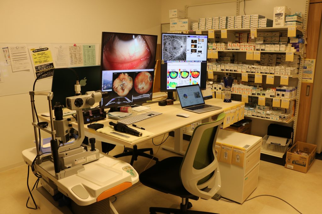 Fig2. The four main displays are for a slit lamp examination image, myPC, and two PCs on the opposite side of my desk. This setup also allows staffs on the opposite side to see my PC monitor. The shelves at the back contain medicine.