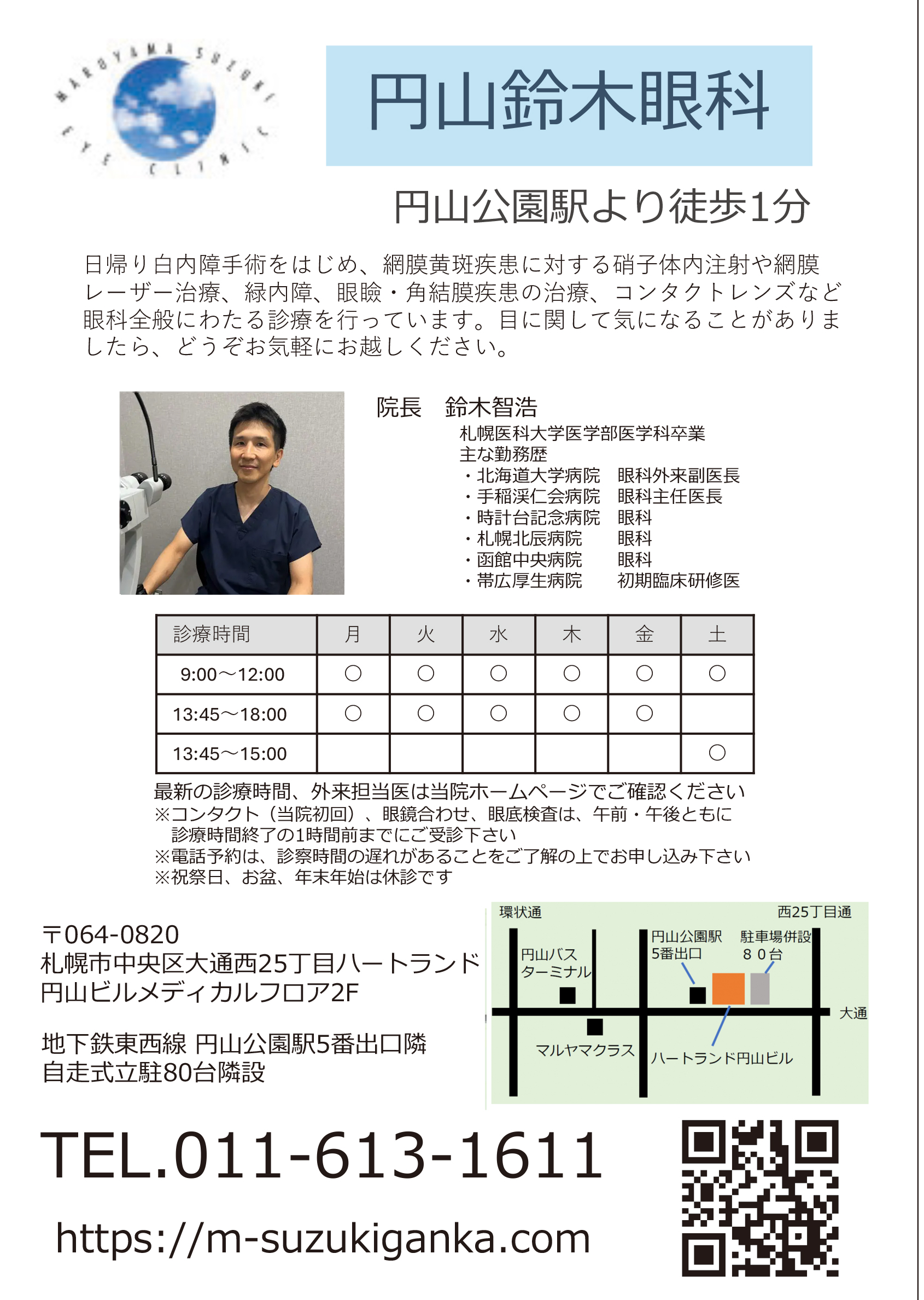 院長 鈴木 智浩円山鈴木眼科は、私の父である鈴木 信敬医師が1987年に開業し、2008年には現在のハートランドビルに移転しました。そして2024年6月から、私が当院で勤務を始めると同時に院長に就任いたしました。