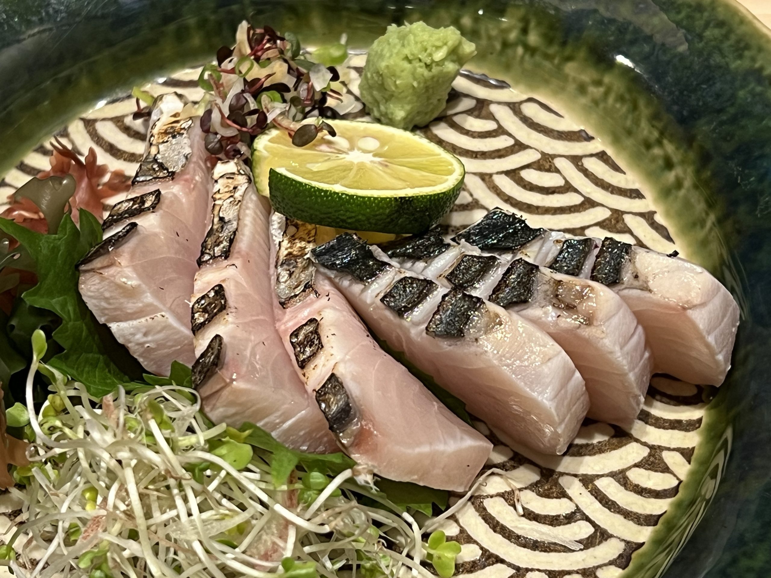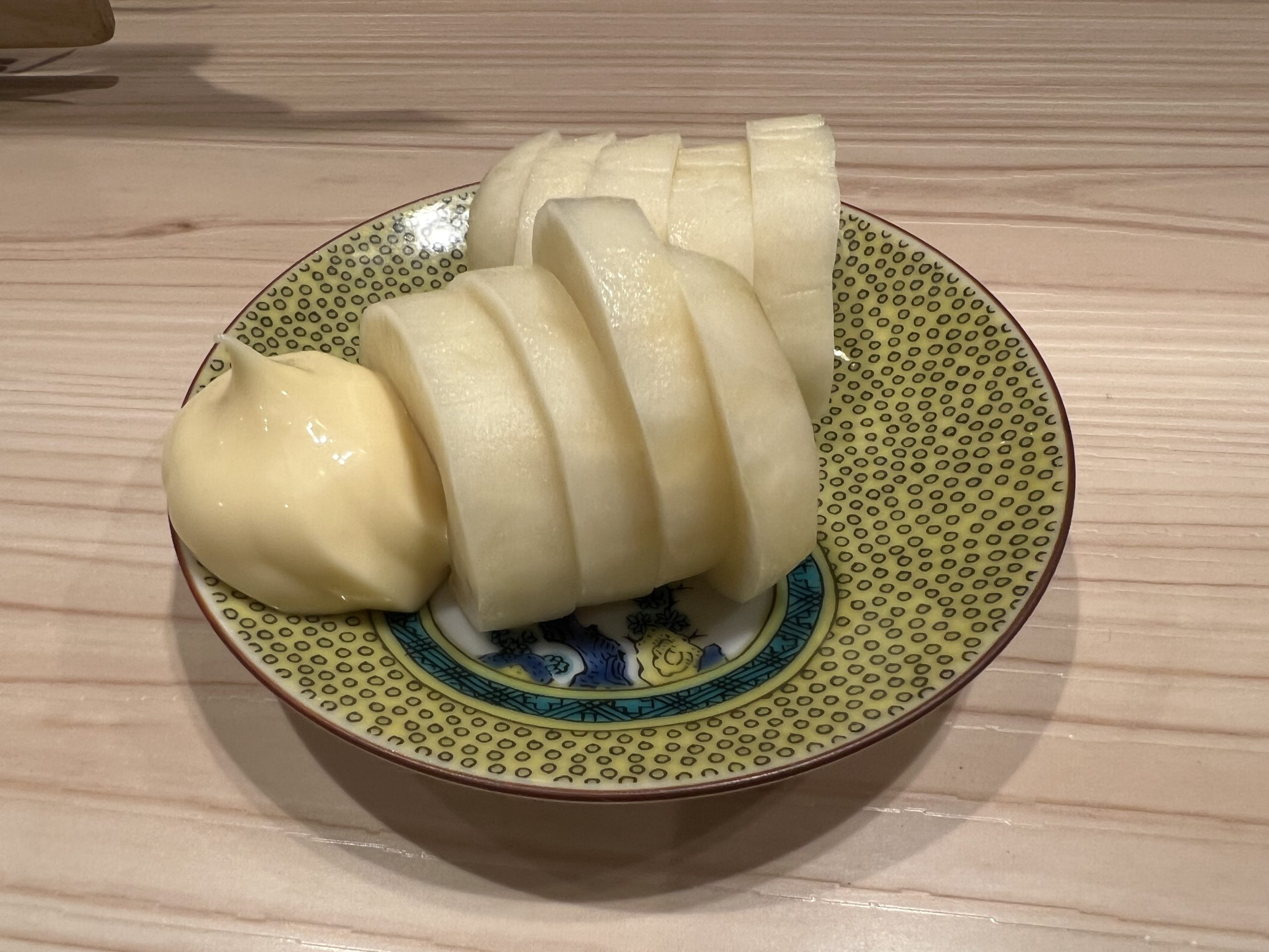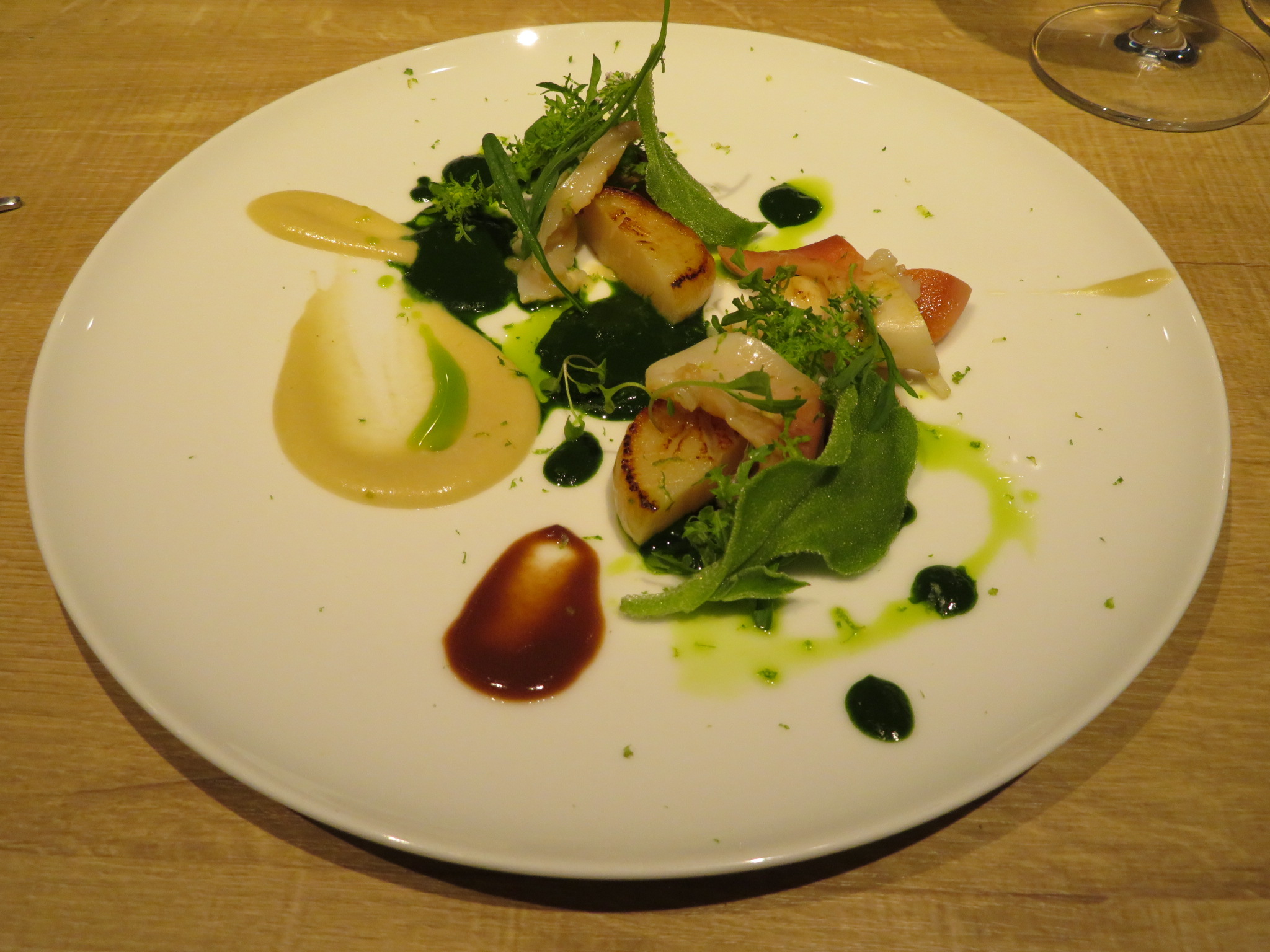 以前の店は白とペパーミントグリーンを基調としたロフト風インテリアであったが、新店舗は白壁と木を使った落ち着いた大人の雰囲気となった。入ってすぐ手前にカウンター席と奥にテーブル席が3つあり、そのうちの一つは角の半個室。前の店とは違って、窓が大きく開放感を感じるようになったことは良かったが、前店舗の空調をそのまま利用しているのか?空調の音が少し気になった。また、調理場は半田シェフ一人のワンオペであるが、料理はテンポよく出された。サービス担当は女性2人で、そのうち1人は「フラノ寳亭留」時代の同僚のソムリエールである。