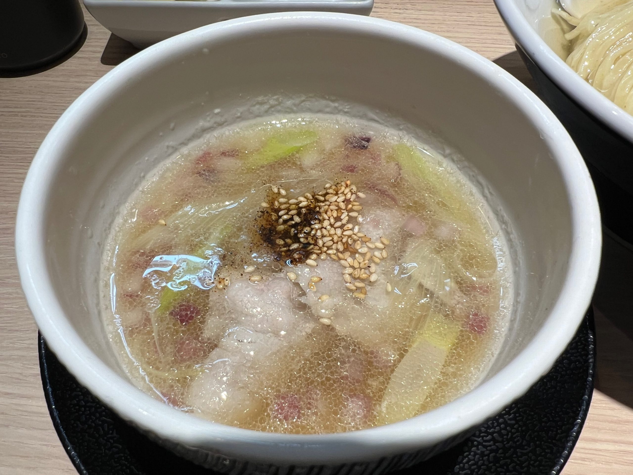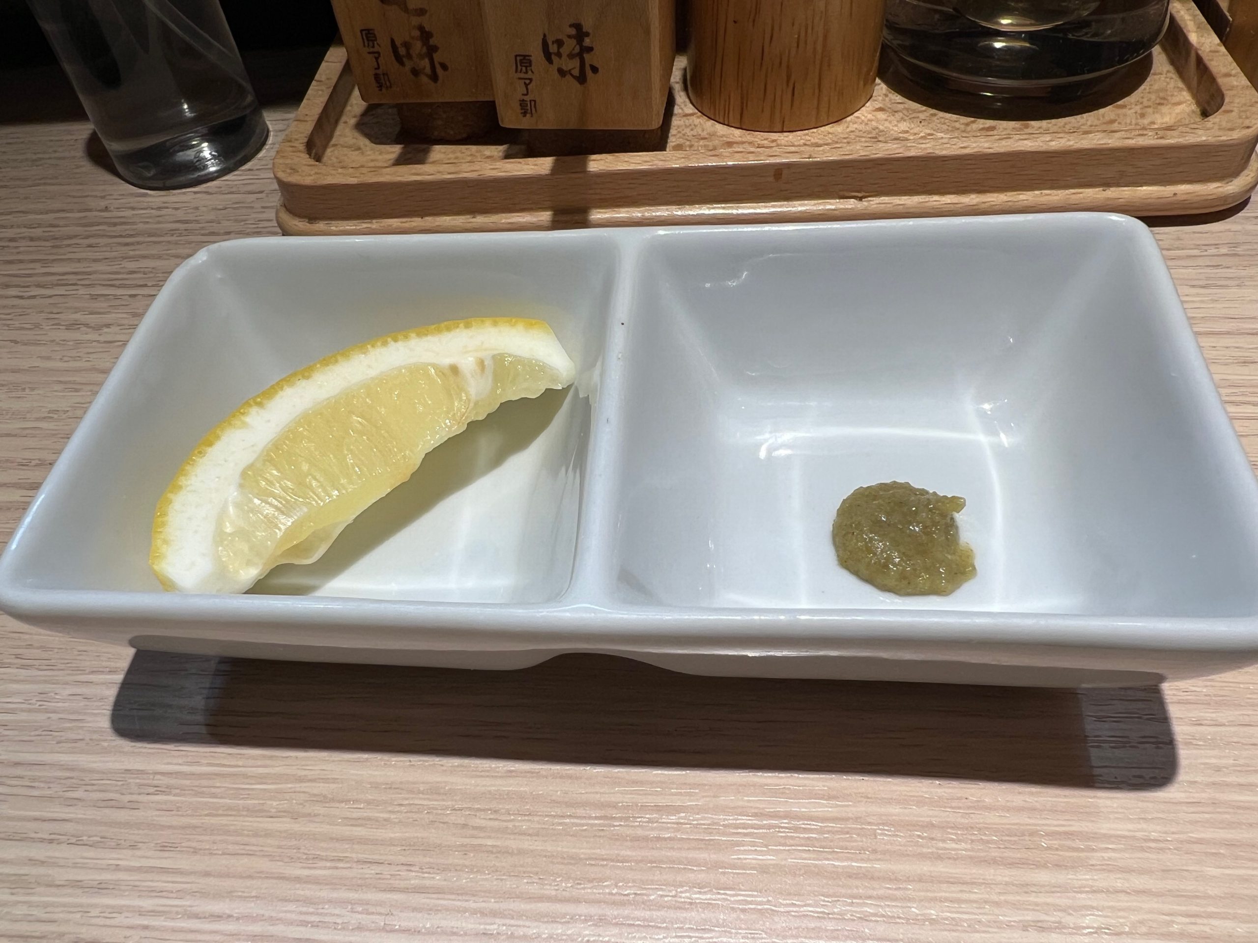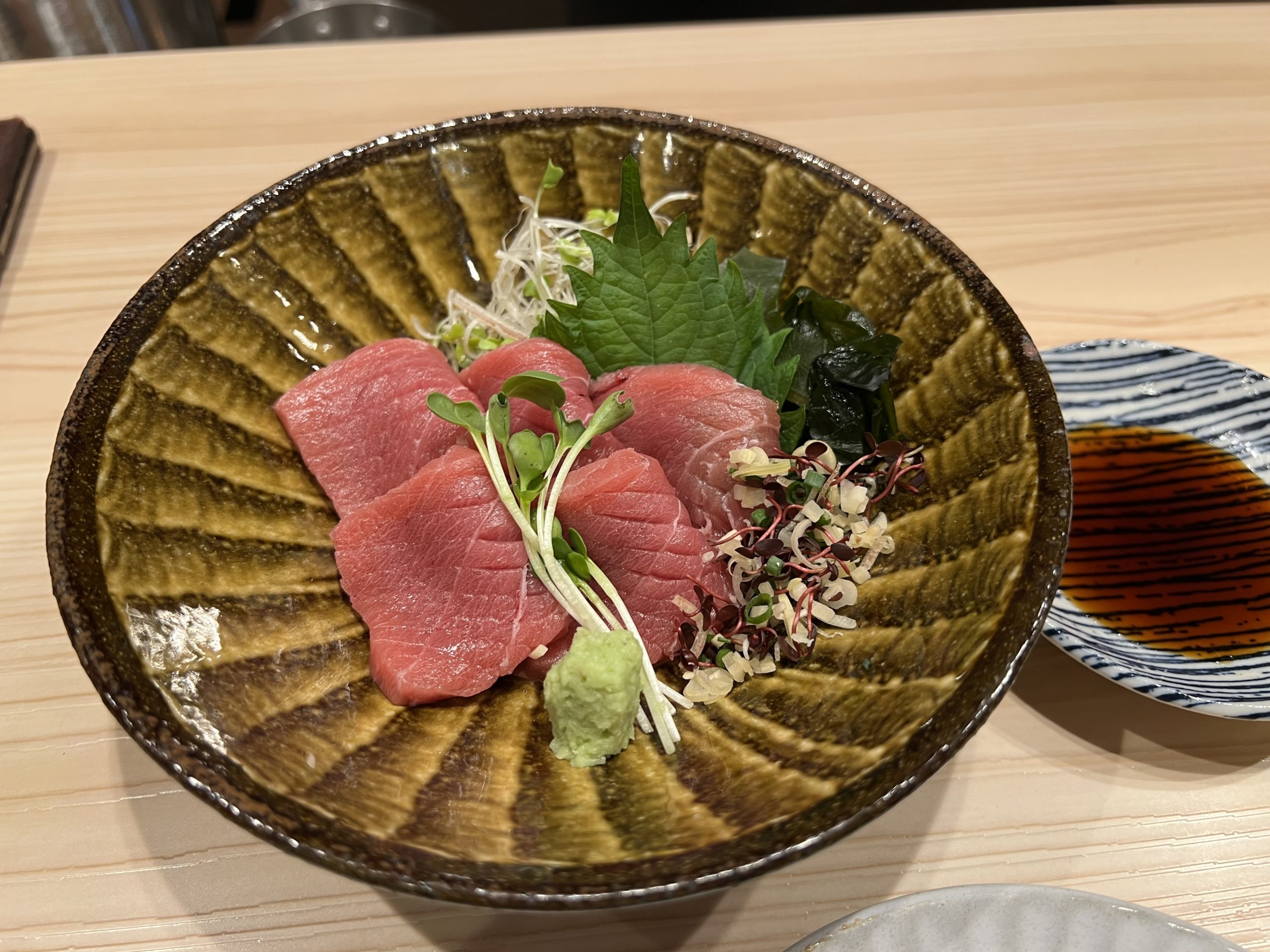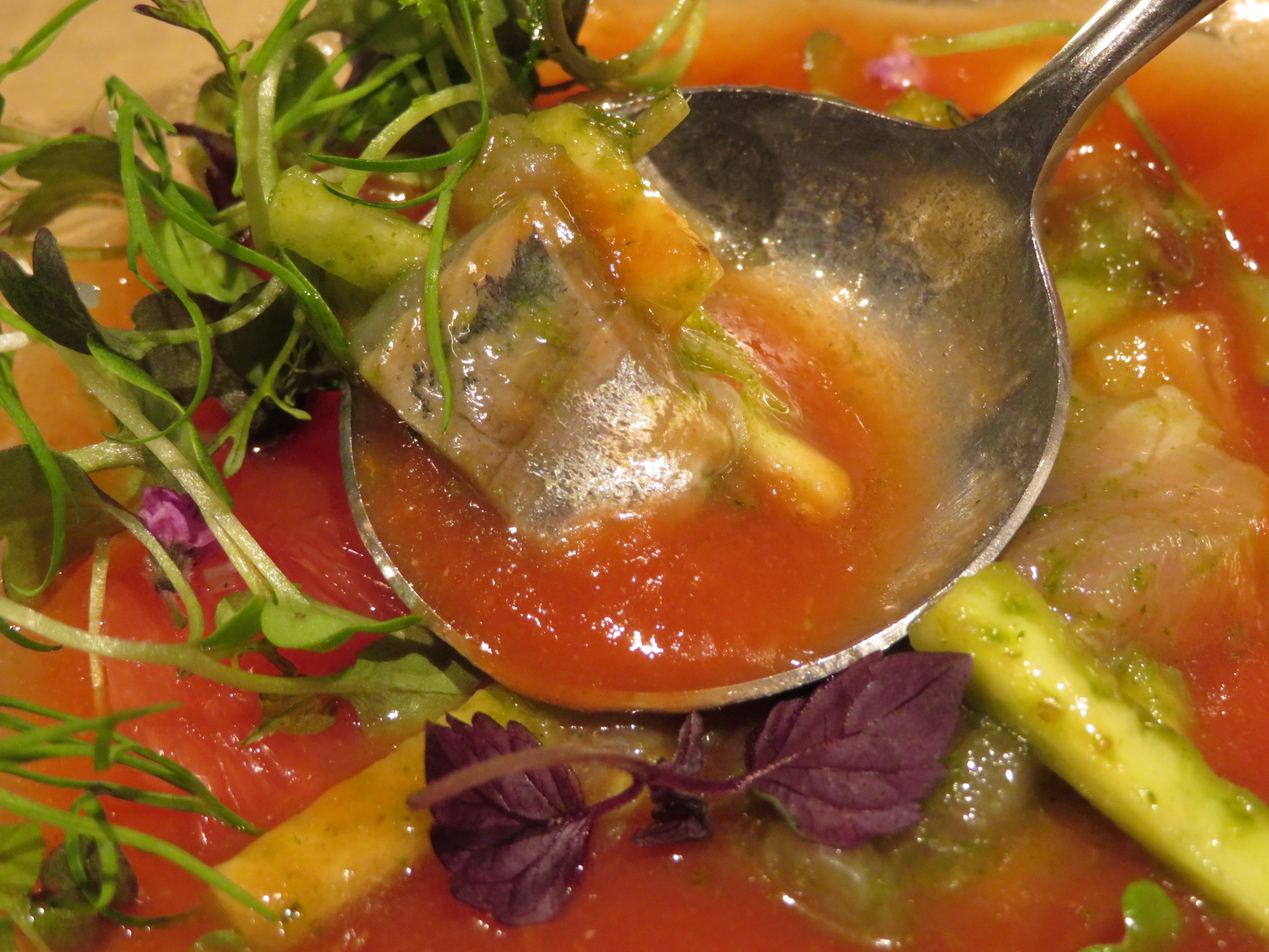 以前の店は白とペパーミントグリーンを基調としたロフト風インテリアであったが、新店舗は白壁と木を使った落ち着いた大人の雰囲気となった。入ってすぐ手前にカウンター席と奥にテーブル席が3つあり、そのうちの一つは角の半個室。前の店とは違って、窓が大きく開放感を感じるようになったことは良かったが、前店舗の空調をそのまま利用しているのか?空調の音が少し気になった。また、調理場は半田シェフ一人のワンオペであるが、料理はテンポよく出された。サービス担当は女性2人で、そのうち1人は「フラノ寳亭留」時代の同僚のソムリエールである。