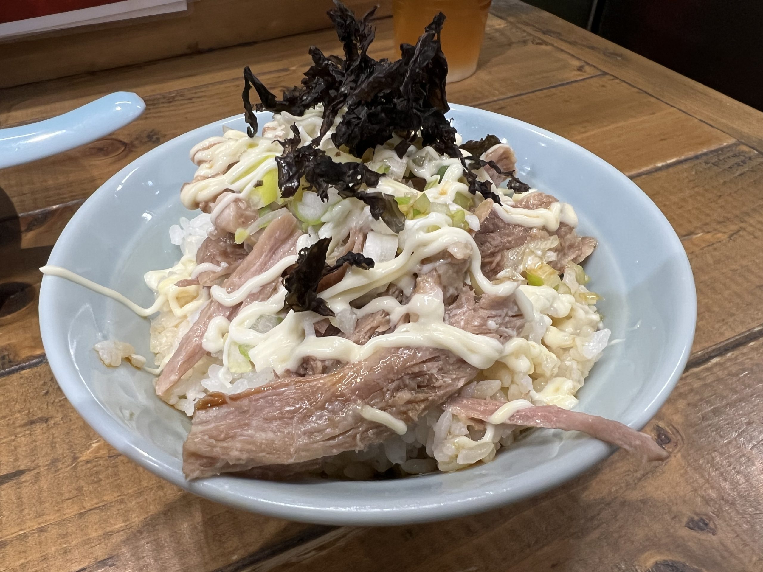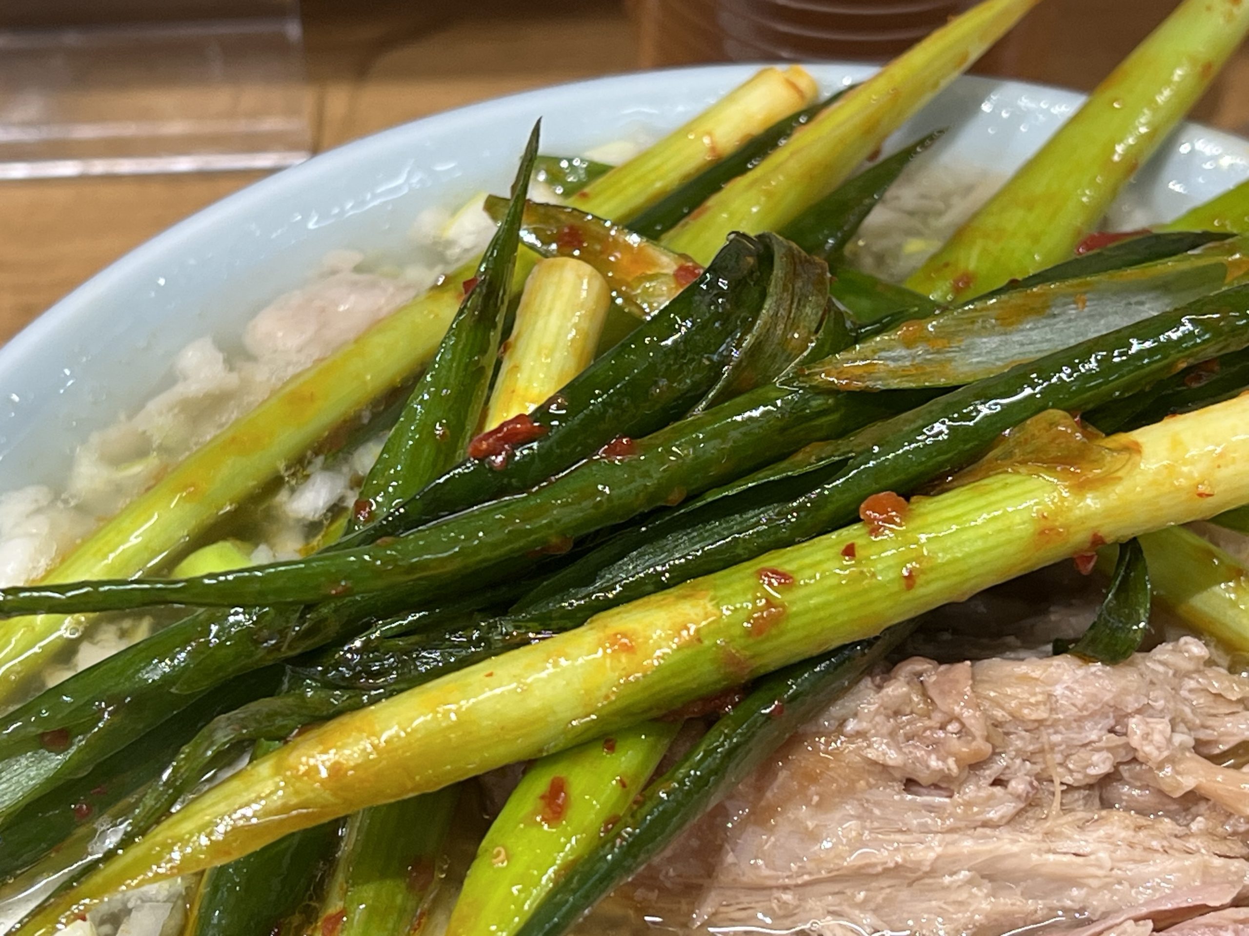 「すみれ系」特有の厚めのトロトロのチャーシューには、すり下ろした生姜がのっている。ネギは白髪ネギで、もちろん、ラードで炒めたモヤシと玉葱入っている