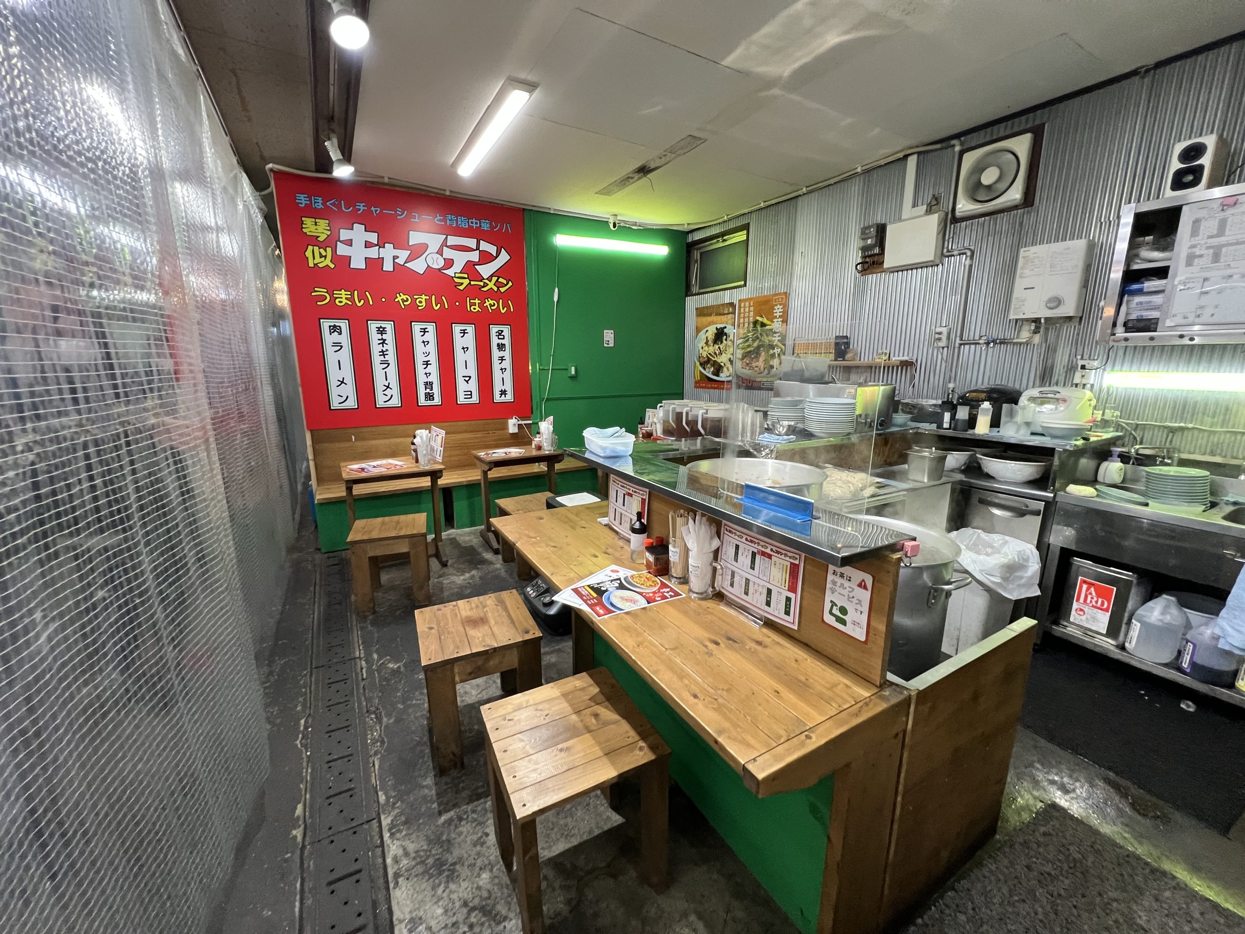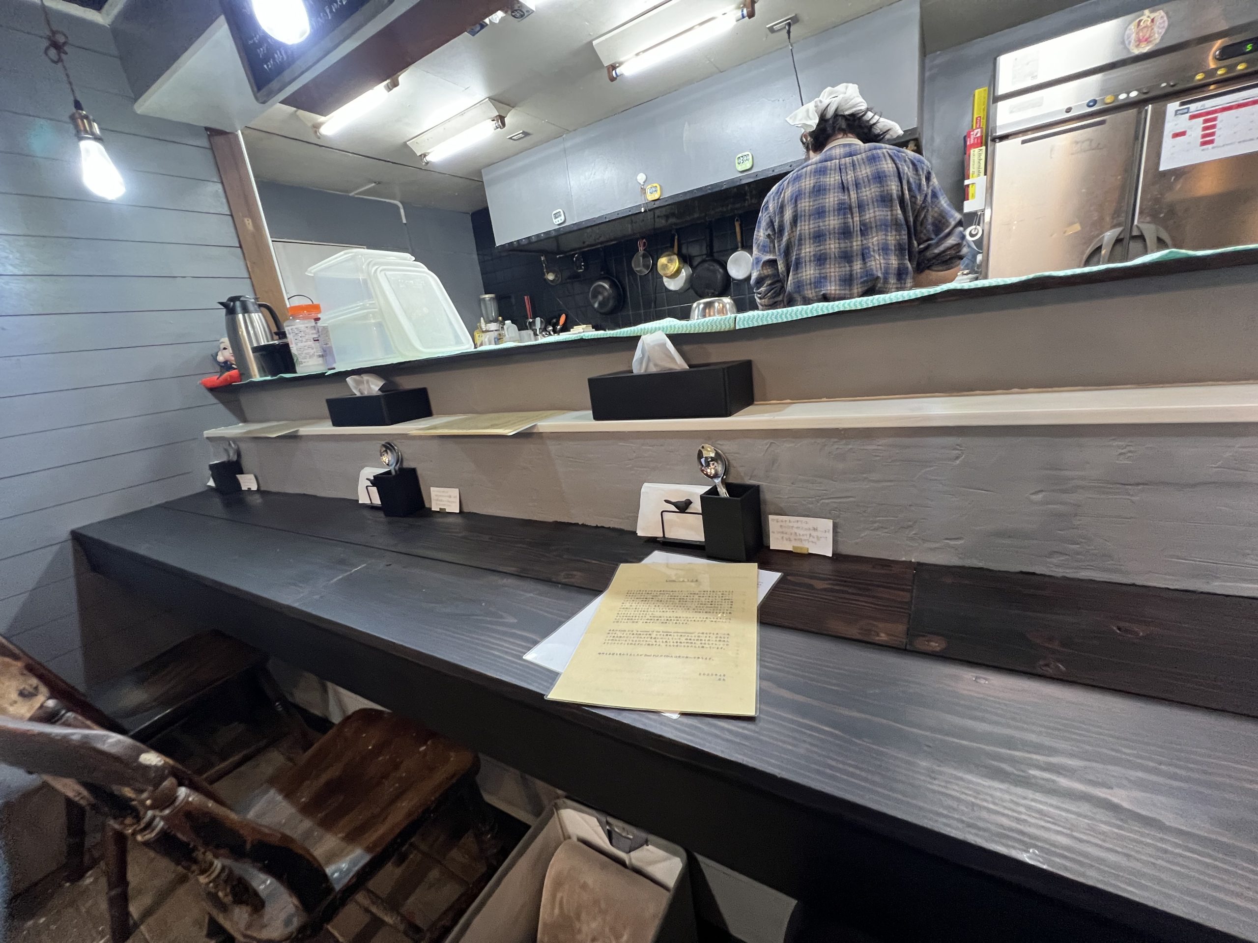 店内は、右にベンチタイプのカウンター席、左に4人掛けのテーブル席が2つある