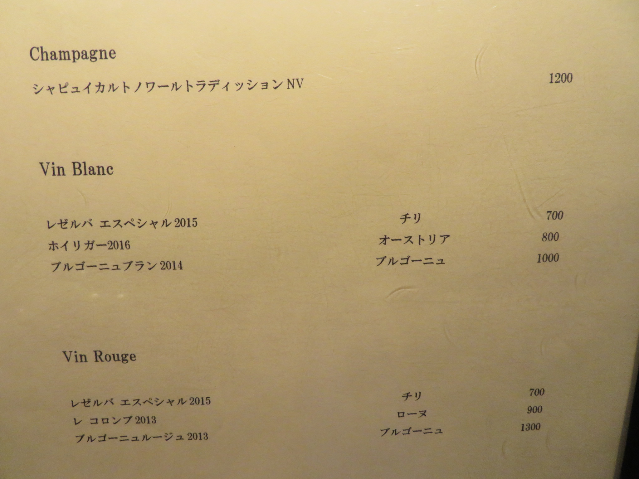 シャンパンリスト。最も高いのが2012年の「サロン」の19万円