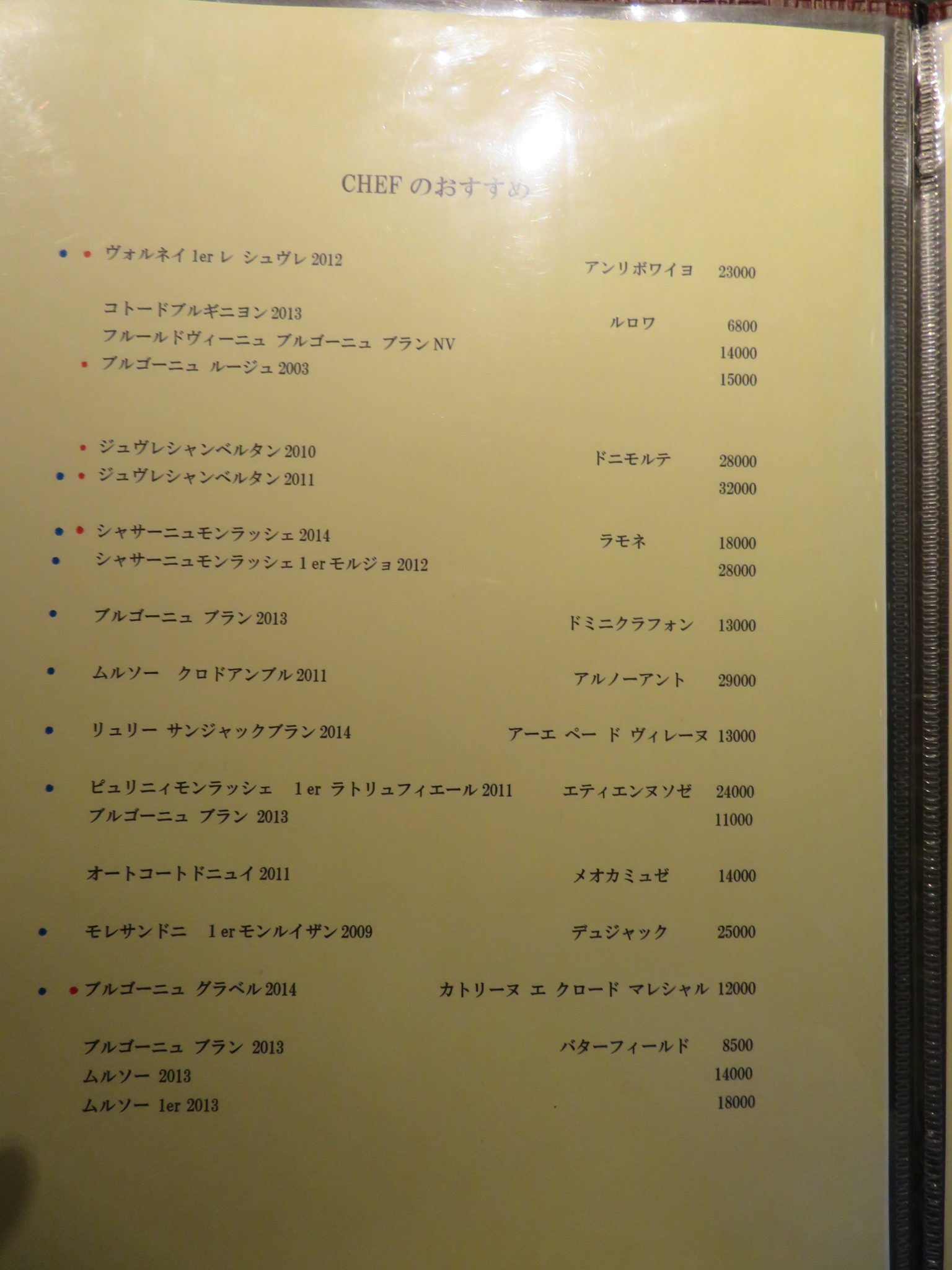 ブルゴーニュワイン(赤)のリストも充実している