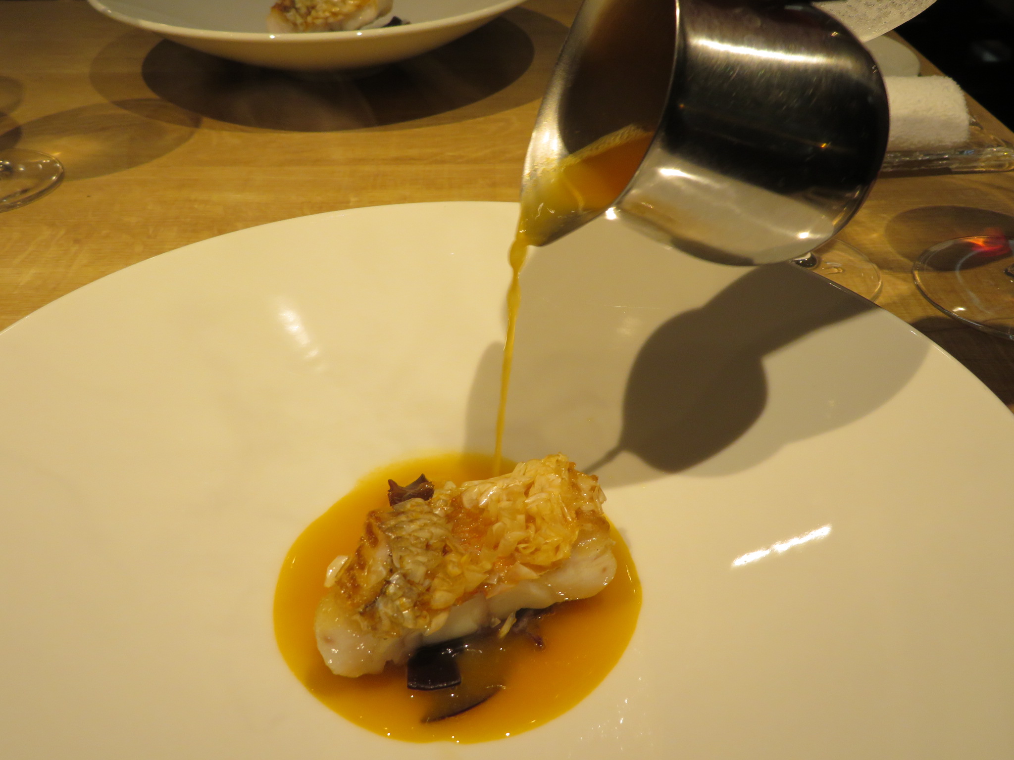 5皿目は「島牧産石鯛のポワレ デュグレレソース」。皮目がパリッと焼かれ、身はしっとりとしている。トマト風味のデュグレレソースは塩味ピッタリでコクがあった