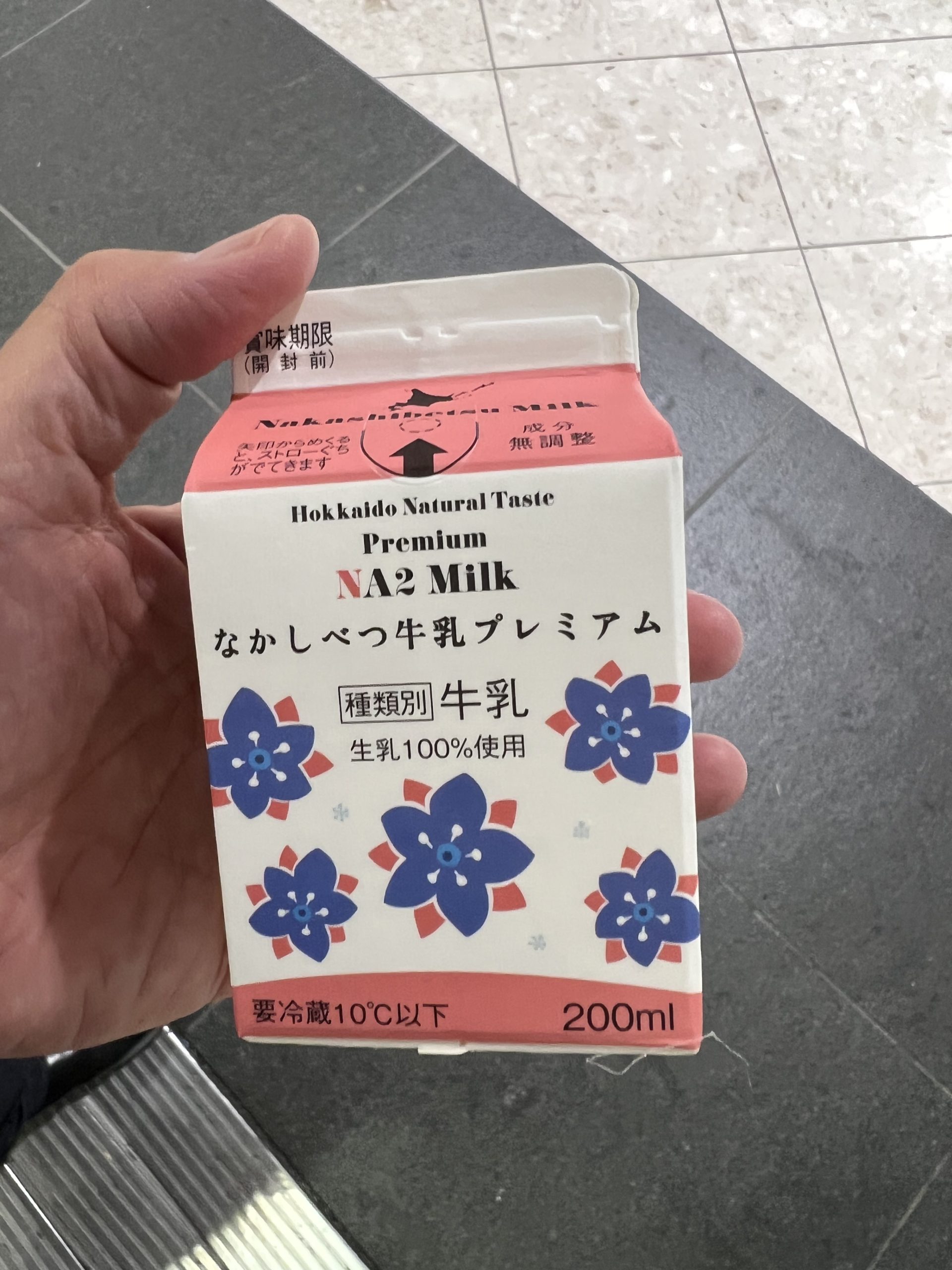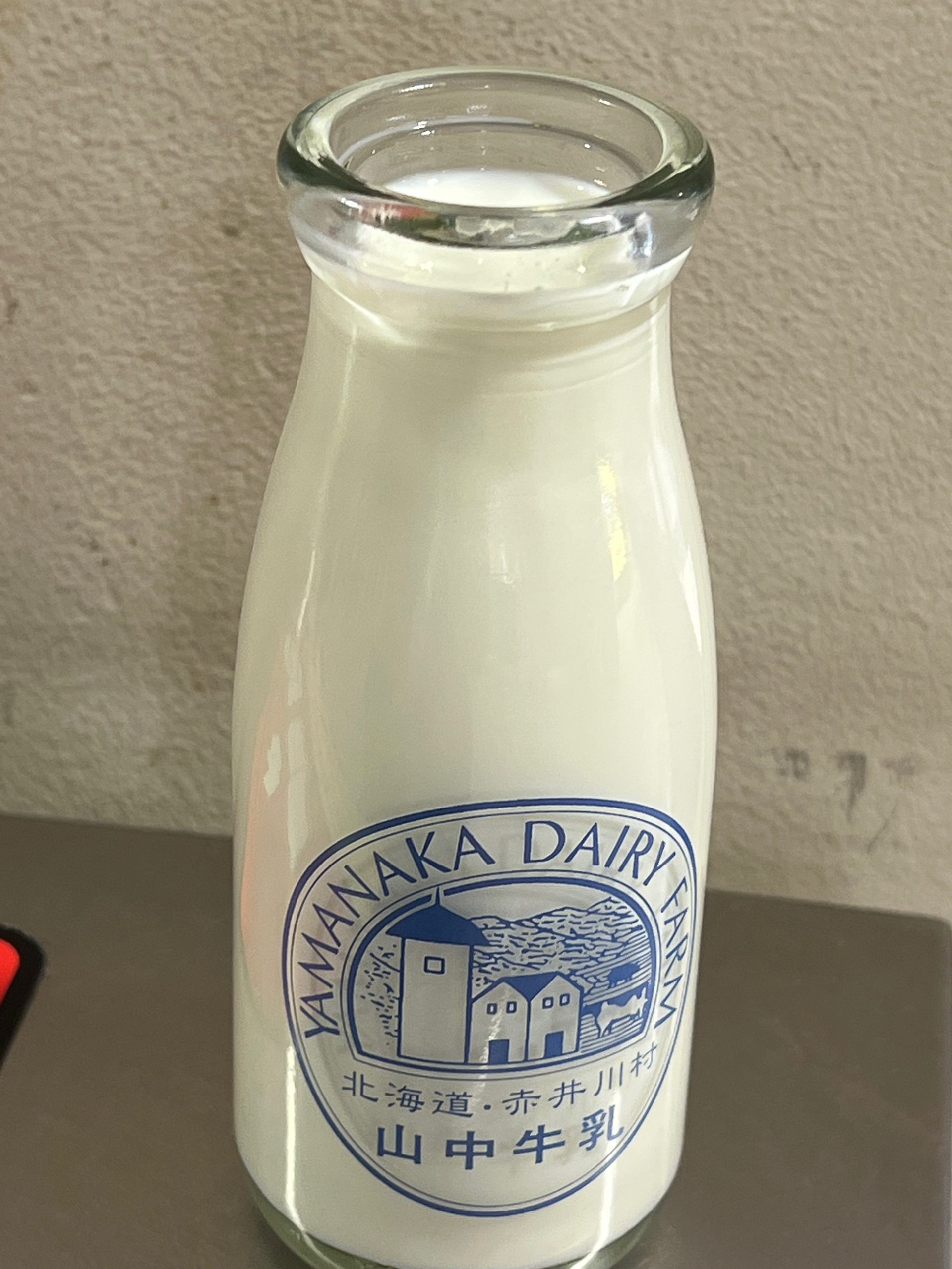 北海道各地の牧場から届いた牛乳と上段にコーヒー牛乳が