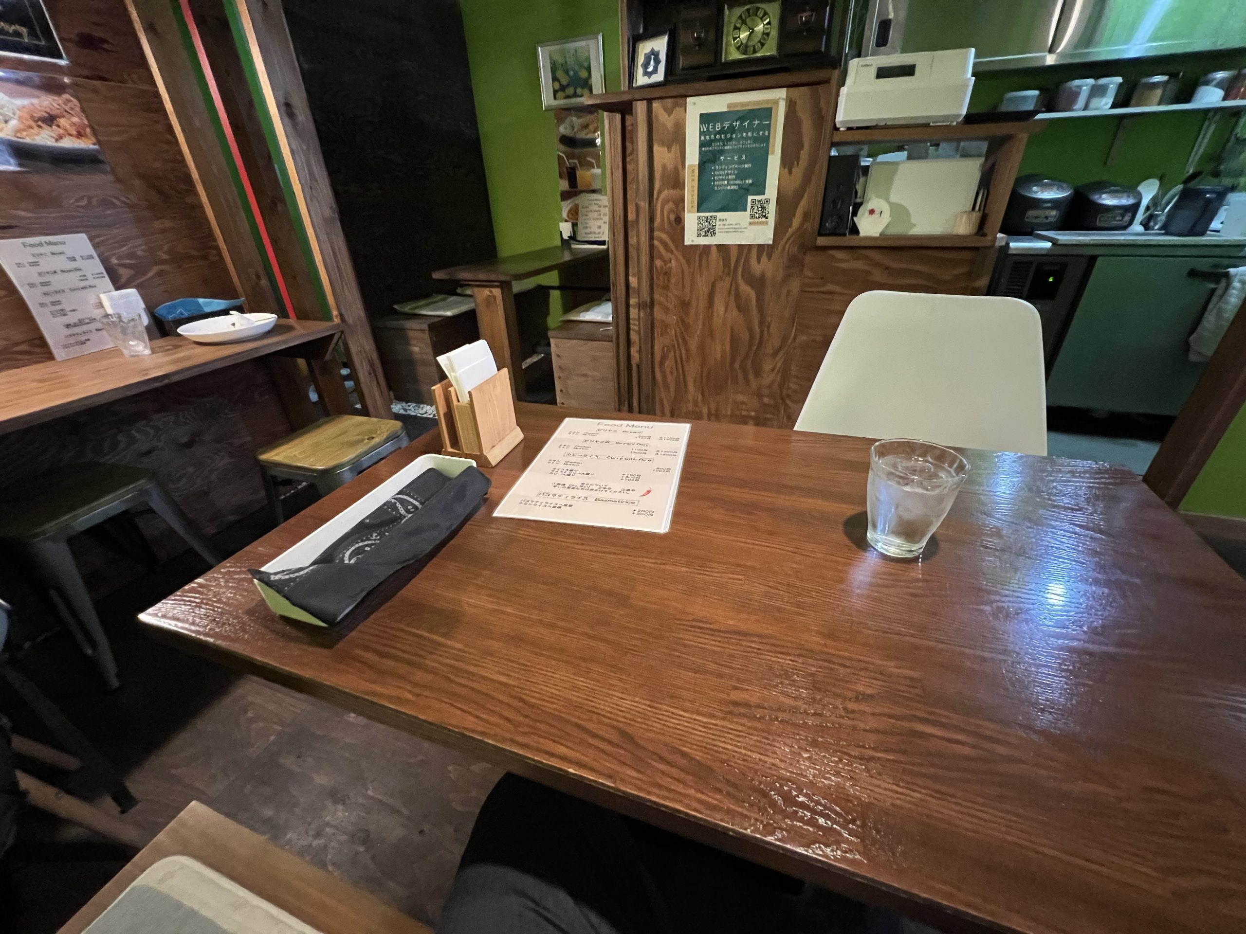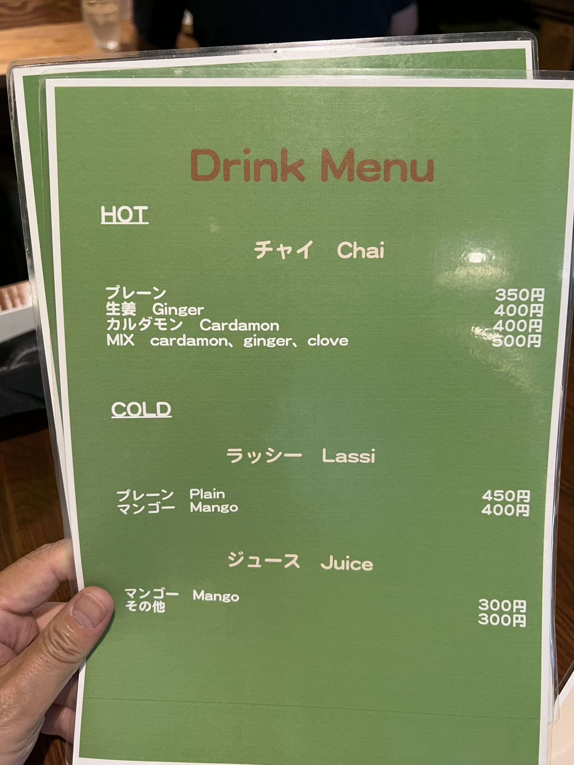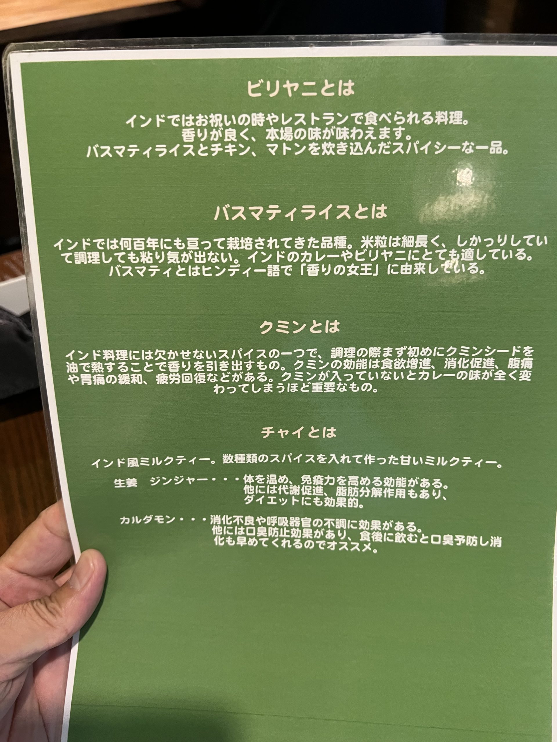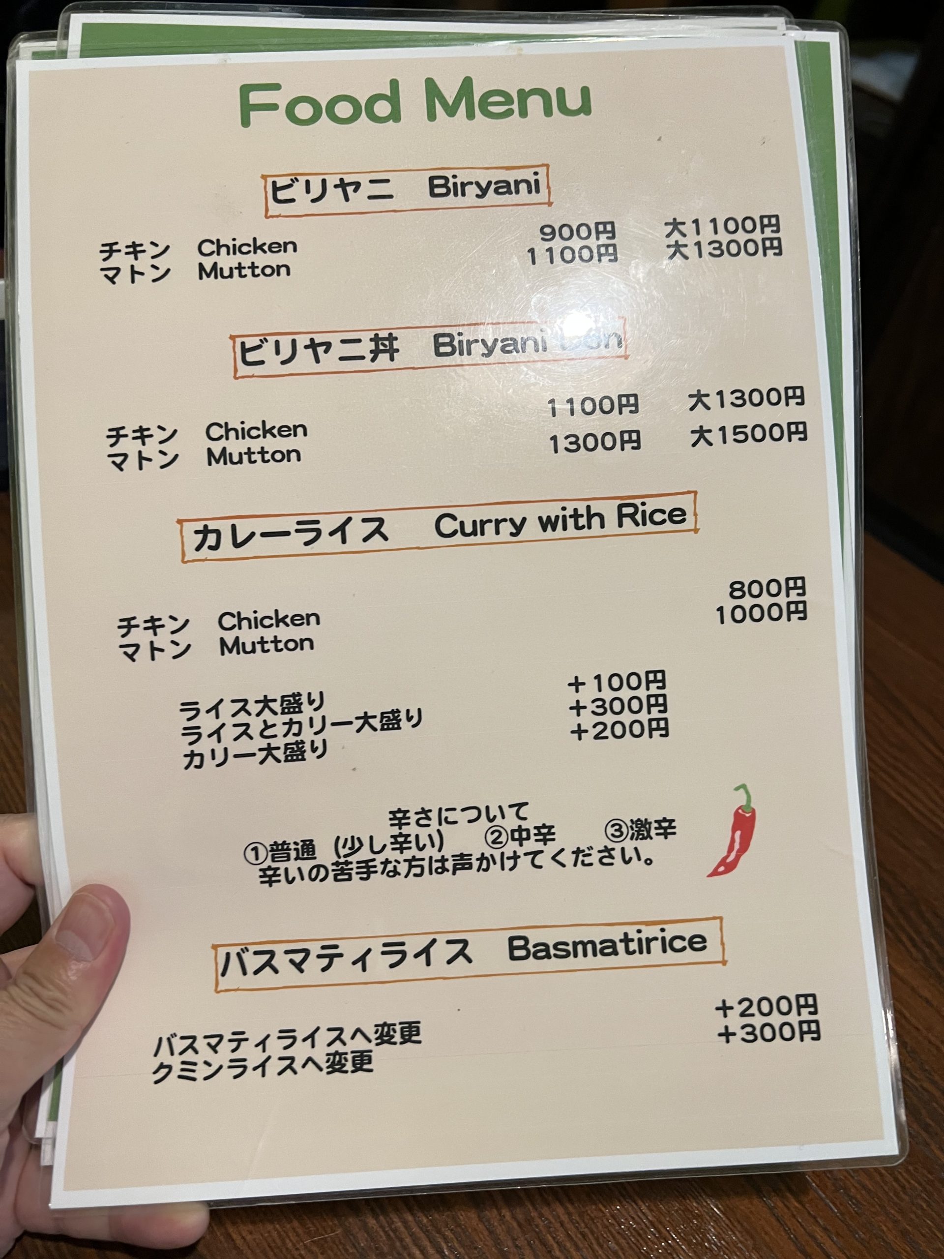 ランチタイムのビリヤニは、「チキン」、「マトン」、「本日の素材(この日はホタルイカ)」の3種があり、お好み2種の盛り合わせも可能。この日のビリヤニのトッピングは、「スパイス半熟卵」、「アイヌネギのアチャール」、「マトンキーマカレー」、「ひよこ豆のココナッツ炒め」の4種。また、通常はランチタイムのみの営業であるが、金曜と土曜はディナータイム営業となる。ランチタイムメニューはビリヤニしかないが、ディナータイムメニューには、「日替わりのビリヤニ」や「カレープレート(ミールス)」の他、「前菜盛り合わせ」や「ドーサ(マサラとマトンカレーの2種)」、「チキン65」などもある。