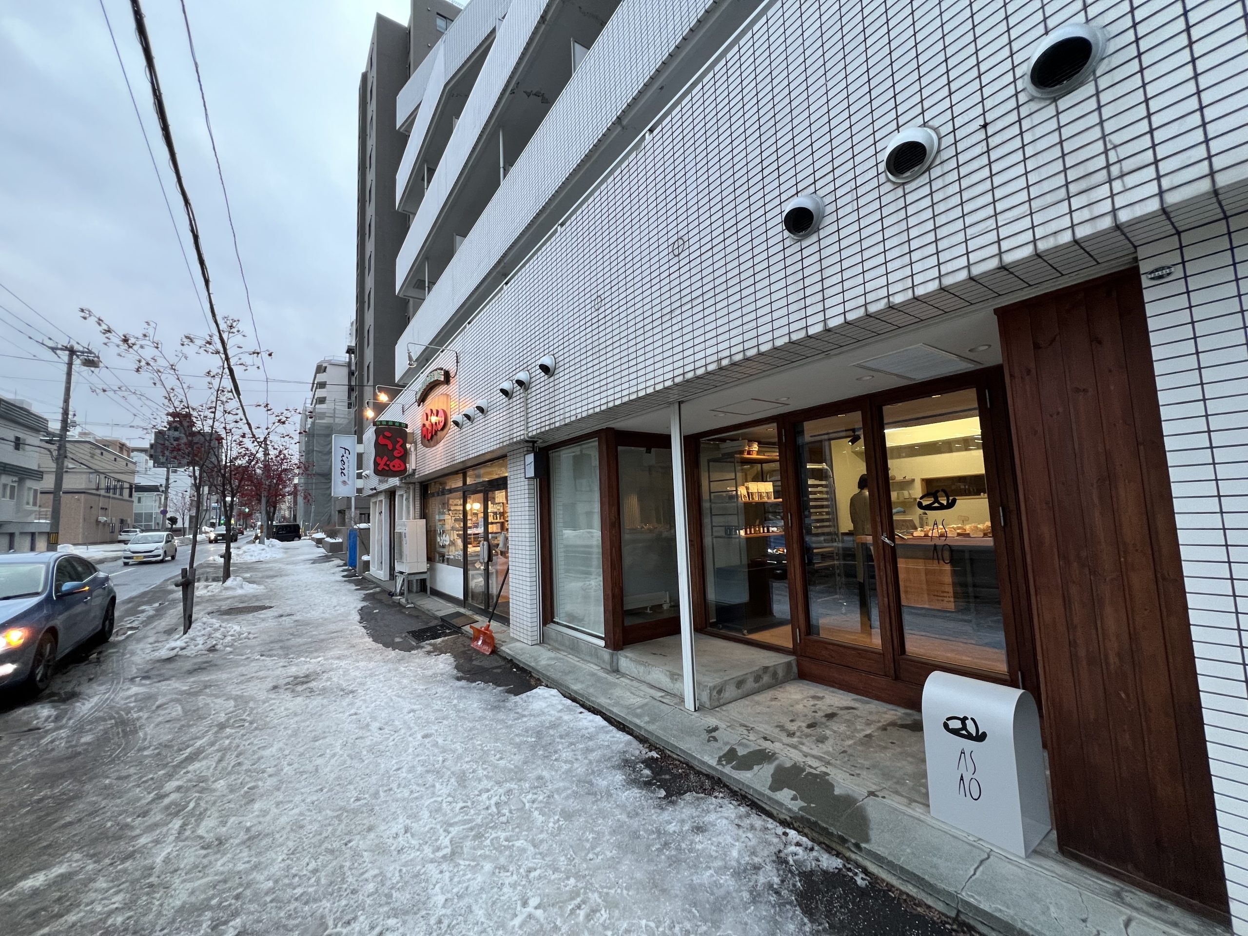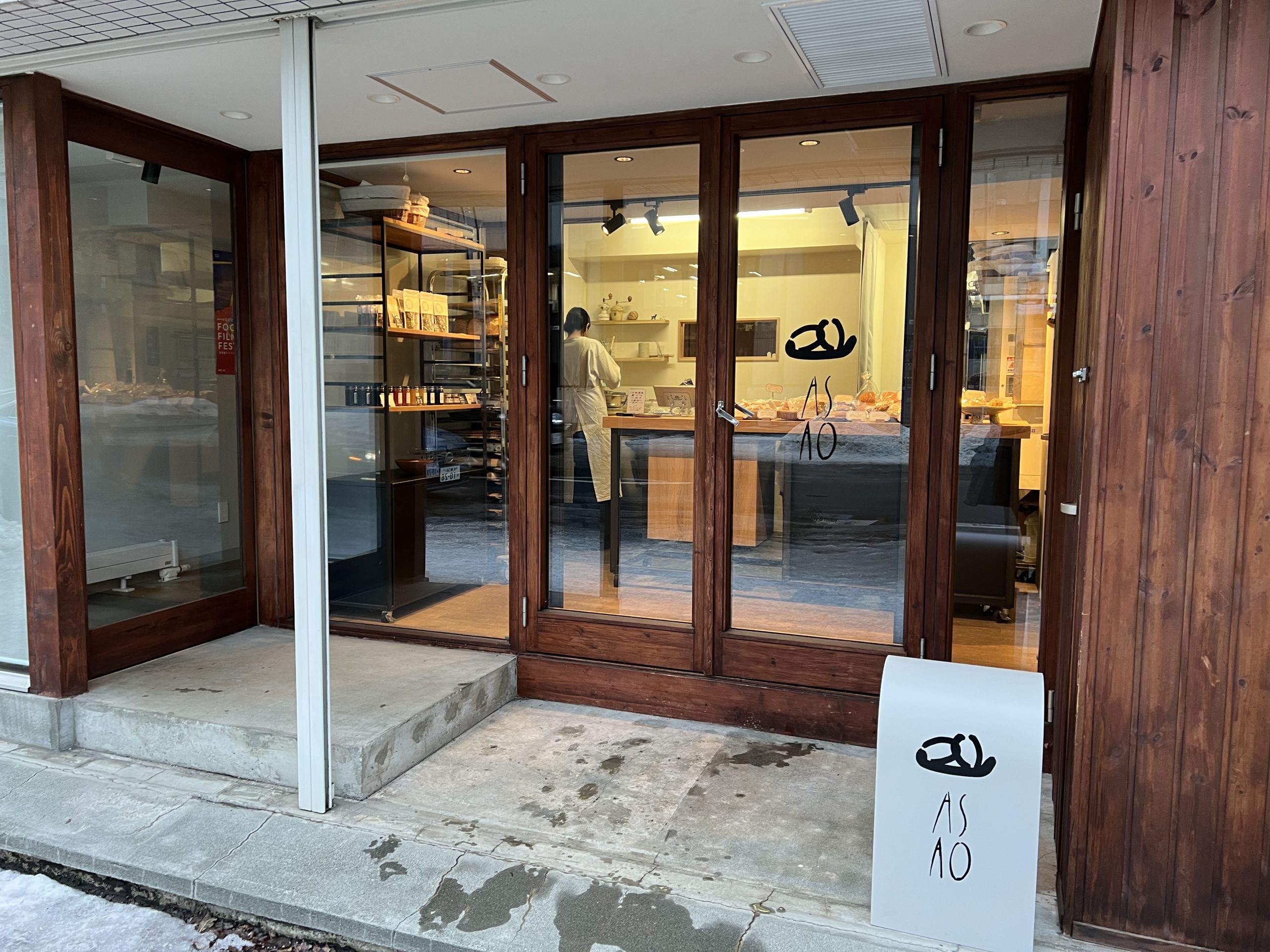 その店舗を2つに分けて、正面エリアに水曜と金曜に奥様がベーカリー「ASAOアサオ」を、奥のレストランで、夜にご主人がフレンチ店を営業するというデュアルスタイル店舗。左側の白いロールスクリーンがかかって中が見えない場所がレストランの入口