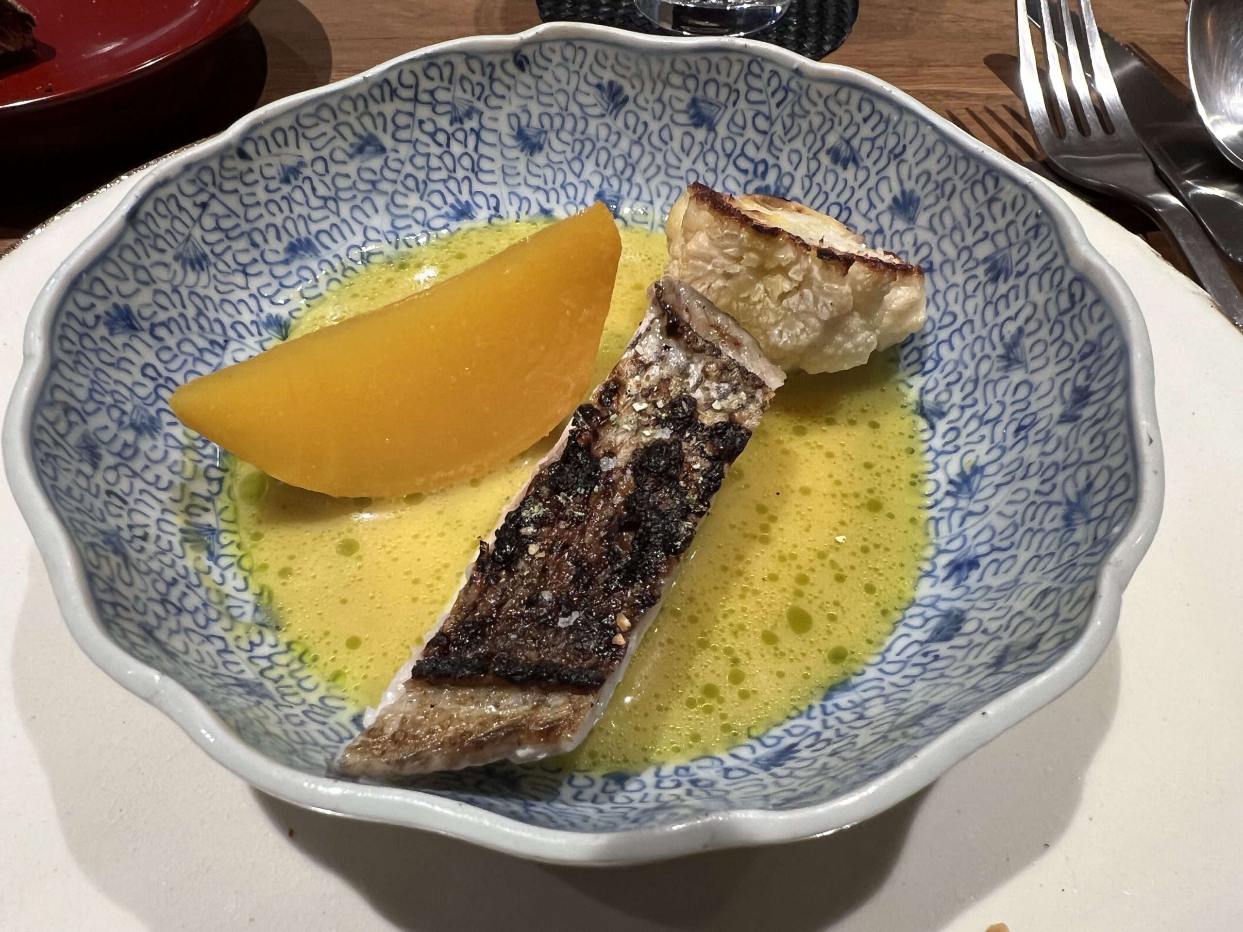 「函館産真鯛のグリル」。真鯛は香ばしく焼かれ、サフラン、白味噌、こぶみかんのソースは、グリーンカレーのようにエスニックっぽい印象