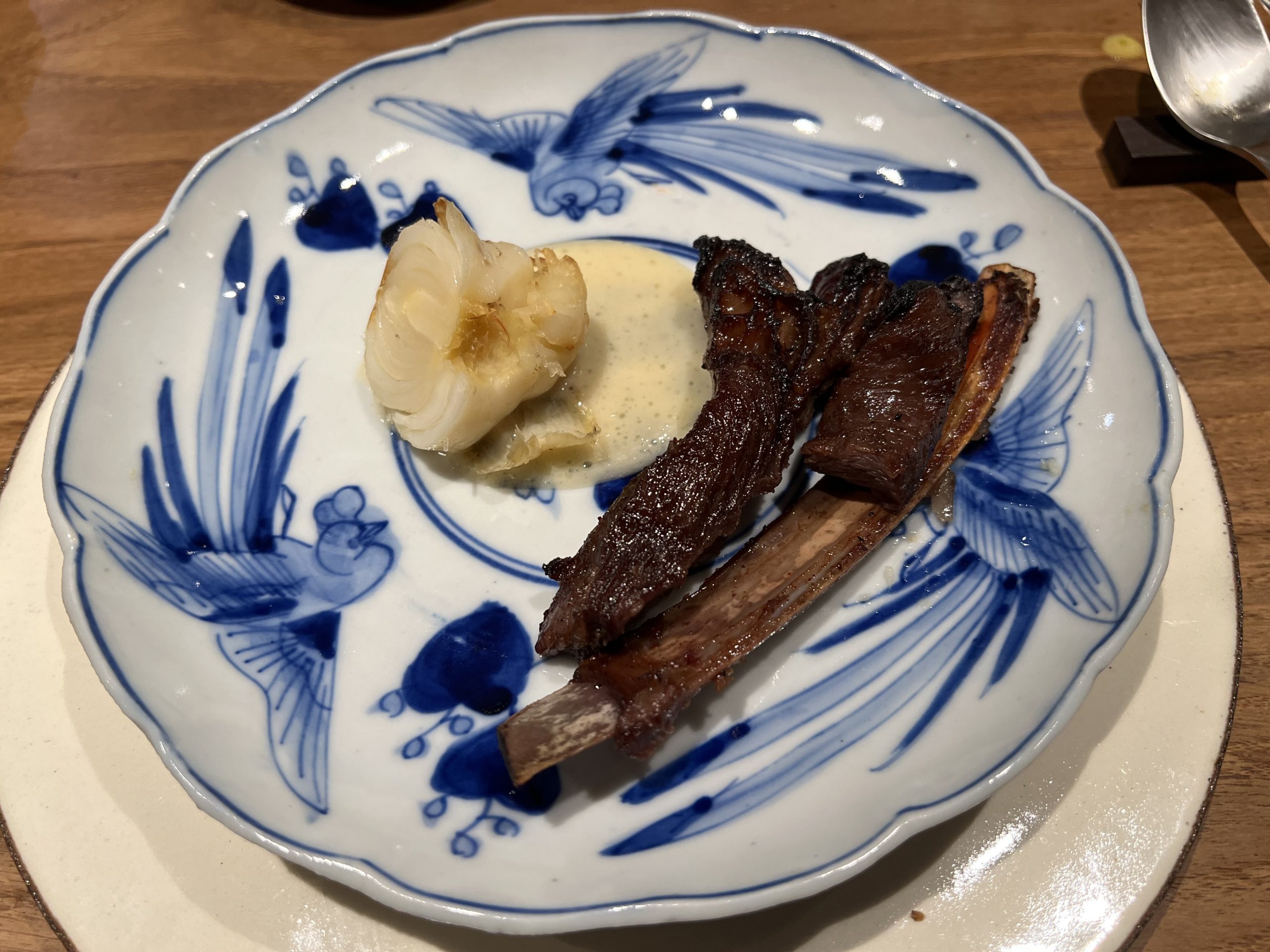 「エゾ鹿のスペアリブ」。醤油でマリネしてローストされている。脂があって鹿肉とは思えないくらい美味しいが、ソースは甘め。ローストされた百合根は更に甘い
