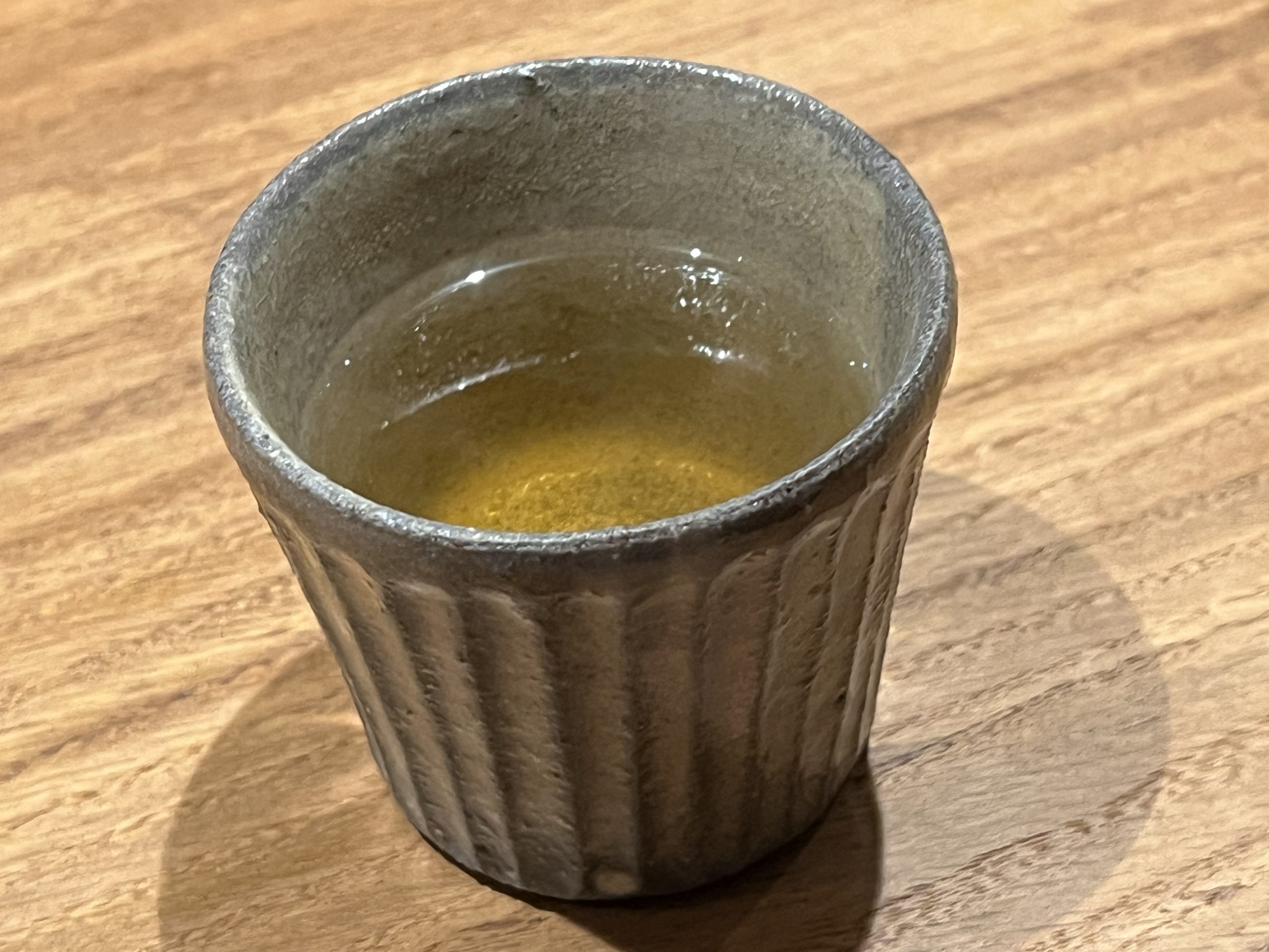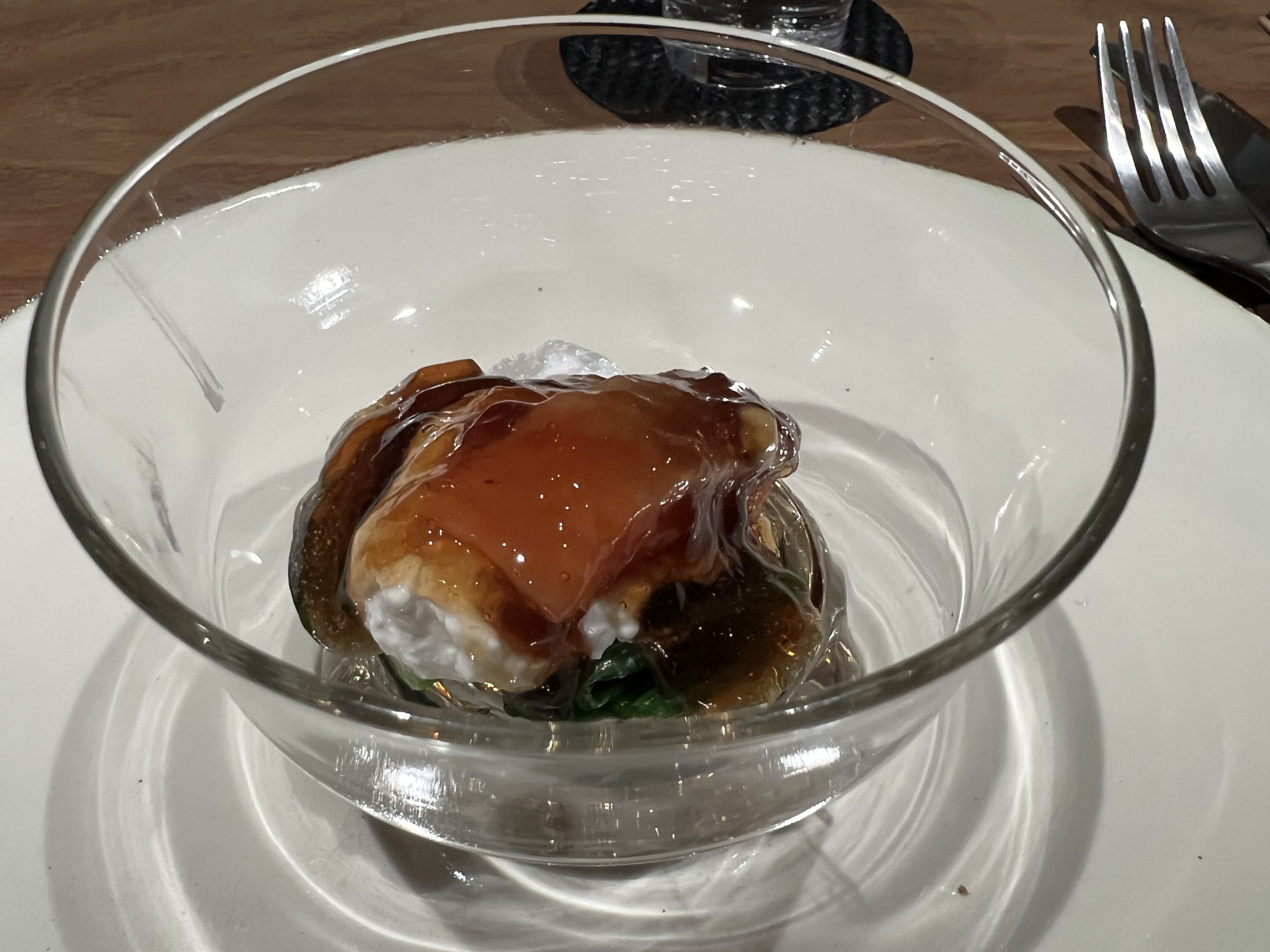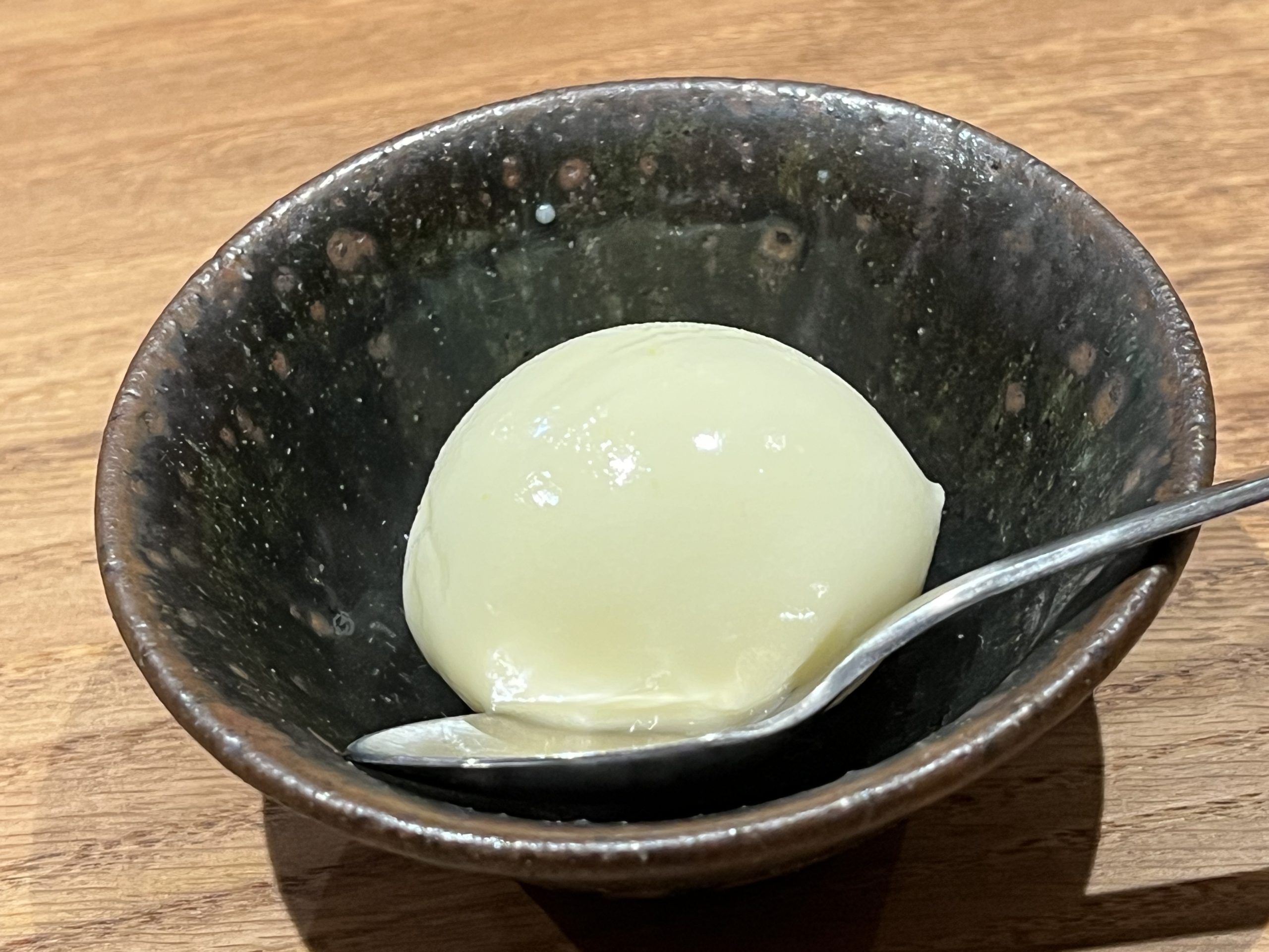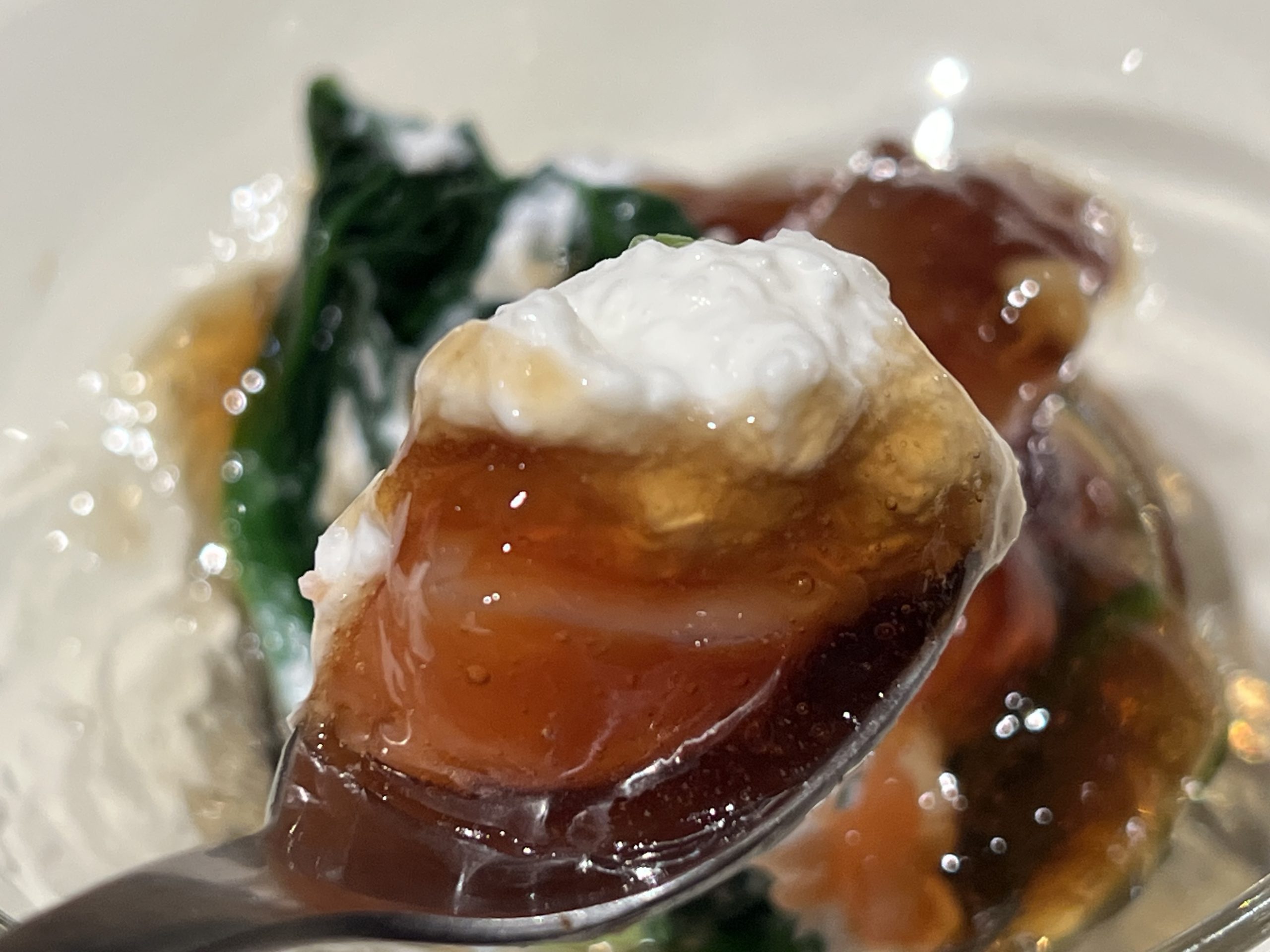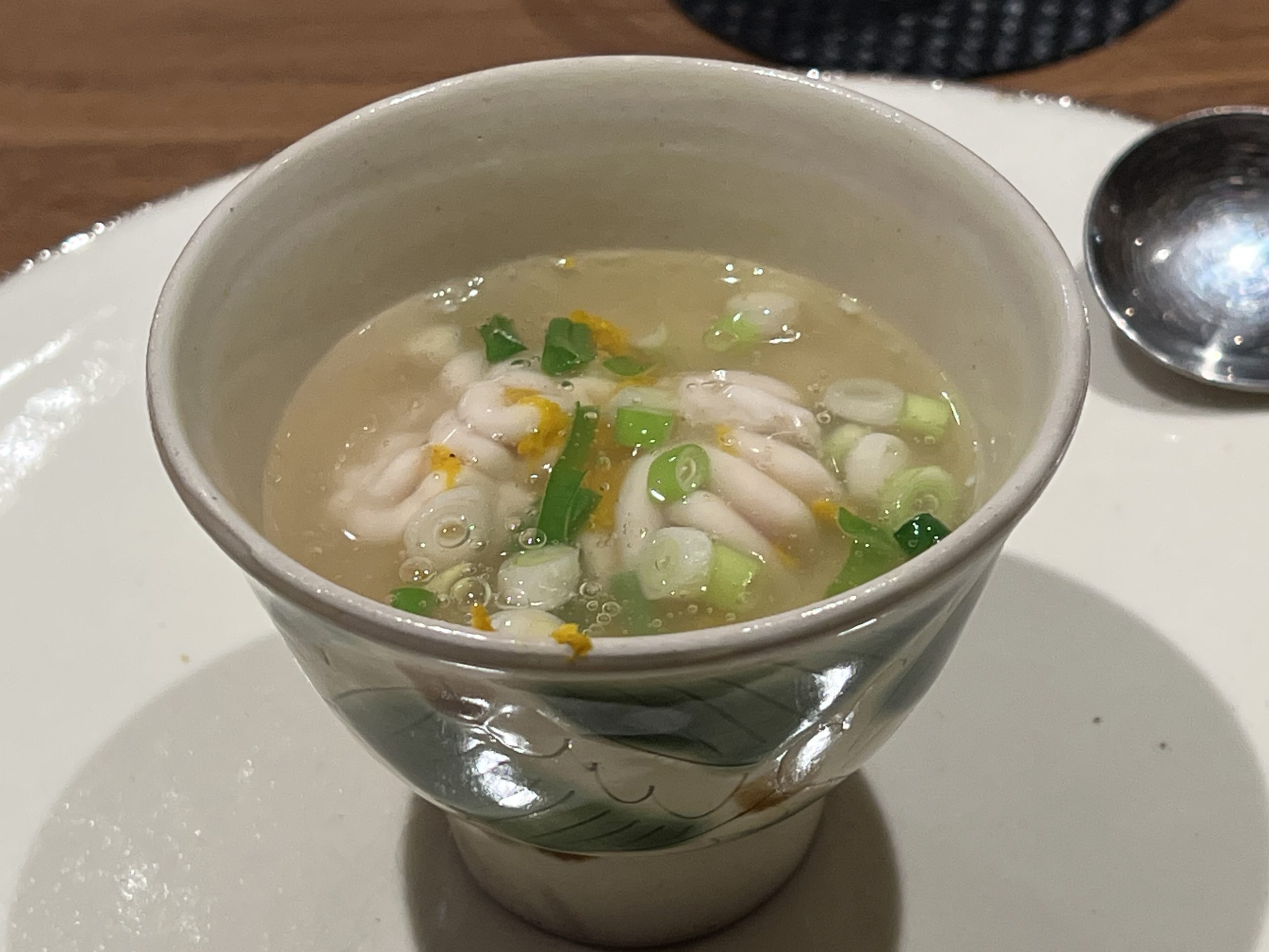 「まだち(真鱈の白子)と菊芋のロワイヤル」。チキンコンソメ餡は塩味ピッタリで、ロワイヤル(一種の茶碗蒸し)というよりもスリ流しのようにトロトロ。同じ食感のまだちもトロトロで、柚子の香りも含めて美味しい