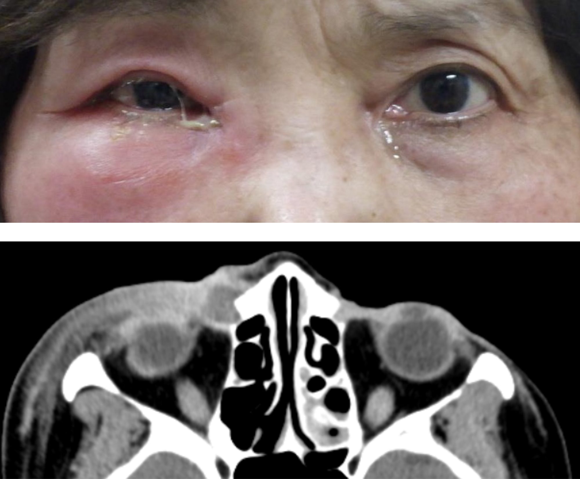 右急性涙囊炎の症例。右上下眼瞼に炎症が波及していた。